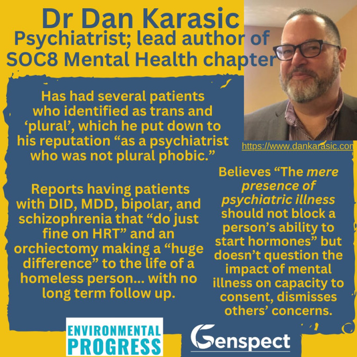 A case discussed in the WPATH files is the adult exhibiting dissociation (as multiple or split personality) revealing that WPATH speed dials hormones and radical surgeries even for unstable adults. WPATH psychiatrist Dan Karasic, prominent in the files, addressed US members in 2017, detailing what he considered a successful case of a “genderqueer” bipolar male who underwent nullification, a surgery eviscerating genitalia to produce a “flat front.”