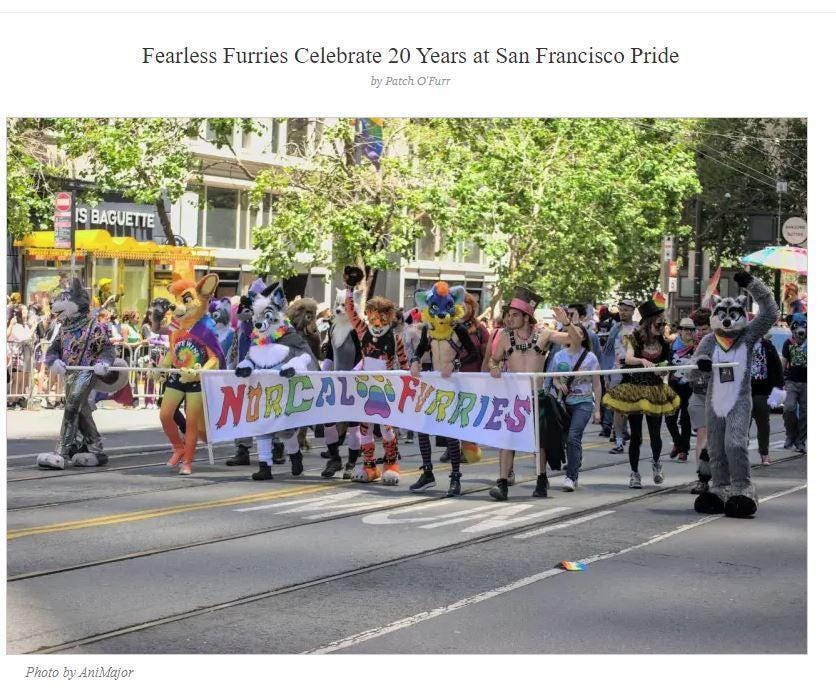A photo from 2022 shows Furries participating alongside pride participants in fetish gear. While furry costumes are not synonymous with fetish gear, kids can be misled.