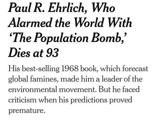 You see Ehrlich also wrote the bestseller The Population Bomb (1968) which predicted worldwide famines due to overpopulation, as well as other major societal upheavals. Here is one example of his foresight: